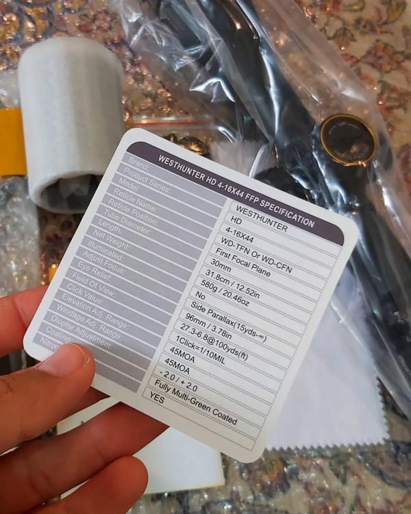 دوربین westhunter HD 4*16_44 ffpسیستم اف اف تیوپ 30 ساید فکوس به همراه هندویل سانشیلد طبلک قفل شونده کیفیت لنزها بسیار بالا HD رتیکل حک بسیار زیبا ، واضح و دات دار شفافیت عالی طول 31 cm وزن 580 gr دوستان این دوربین از کیفیت تصویر و ساخت بسیار خوبی بهره میبره ، رتیکل زیبا ، اف اف پی ، رینگ ۳۰ و ساید فوکس یک انتخاب ایده آل برای پی سی پی هست .